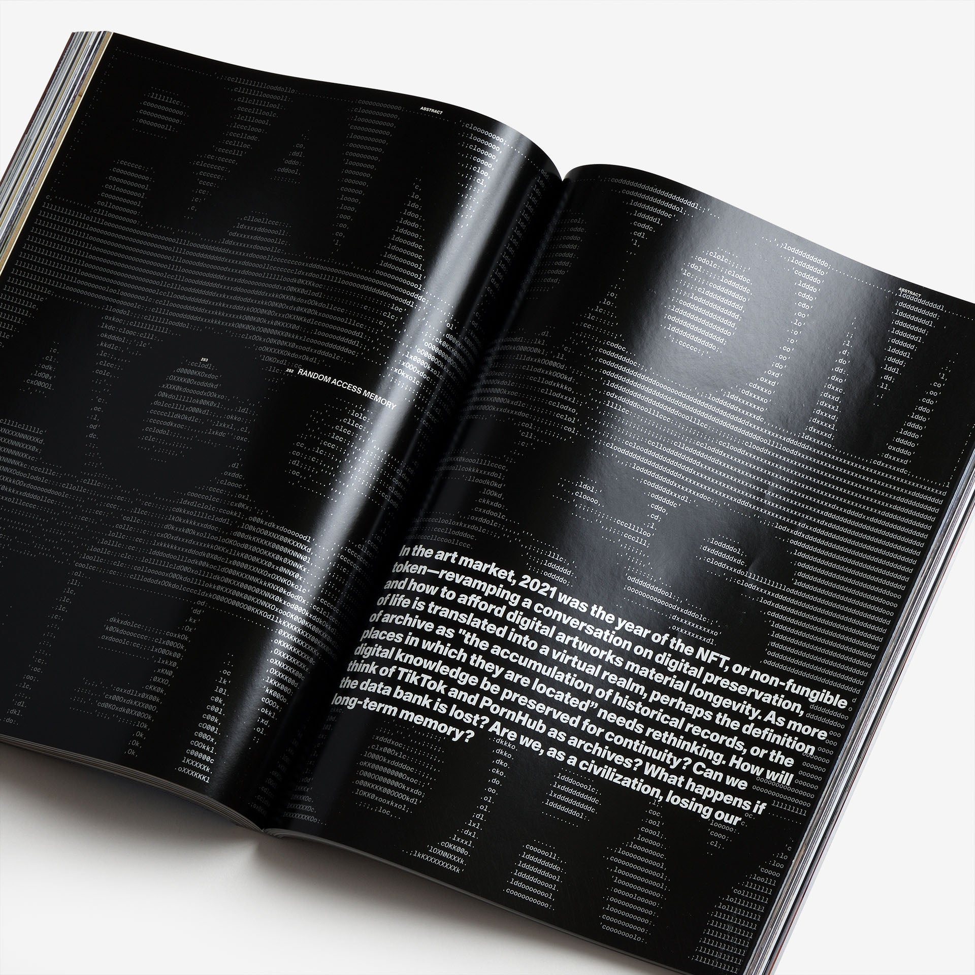 ABSTRACT, our text-only editorial segment dedicated to urgent research questions of our time, is titled Random Access Memory and addresses the concept of “archiving” in the digital space. In the art market, 2021 was the year of the NFT, revamping a conversation on digital preservation. As more of life is translated into a virtual realm, perhaps the definition of archive needs rethinking. Through three essays by Michael Connor, Philip Maughan, and Nicholas Korody, we find that maybe, the role of archiving is only just beginning.