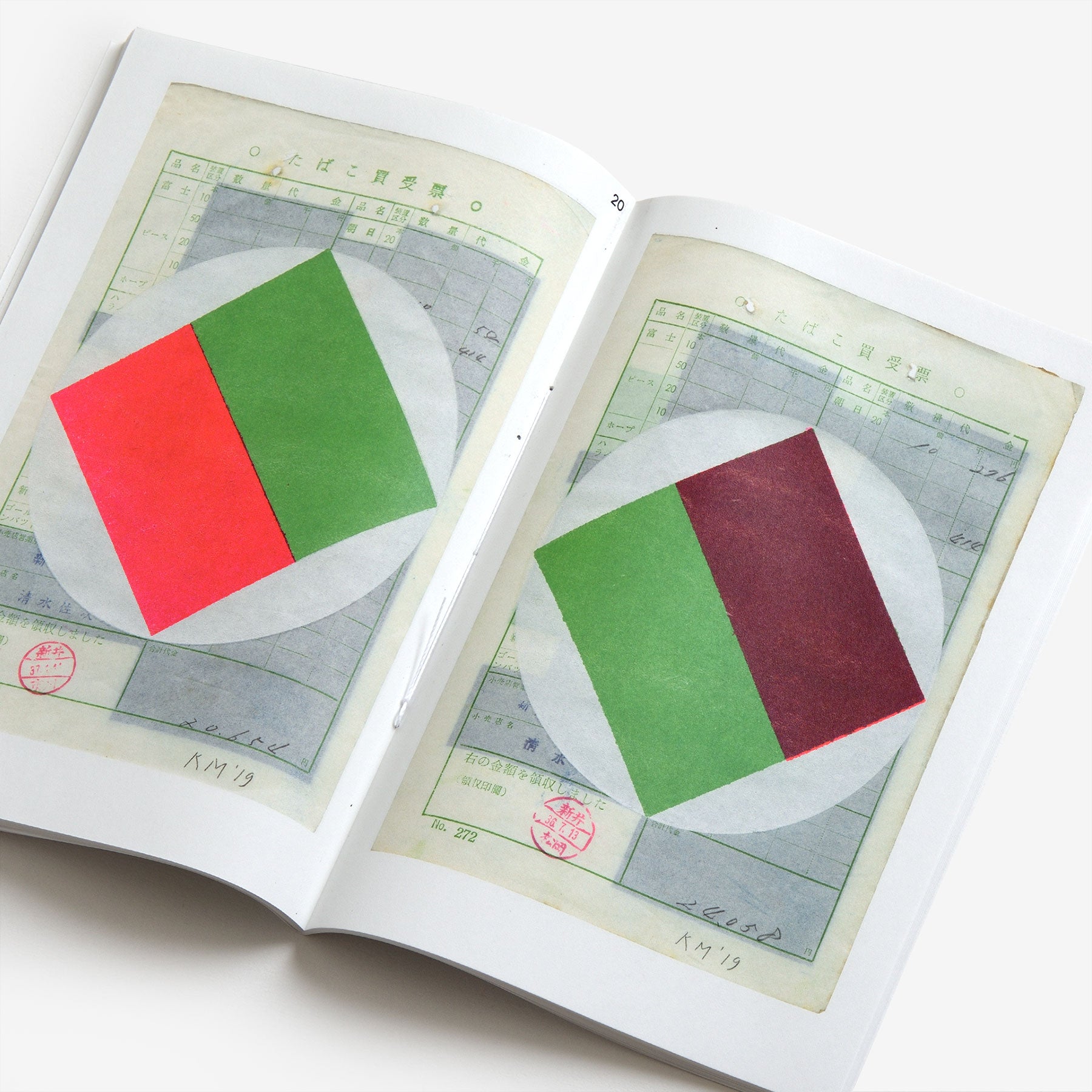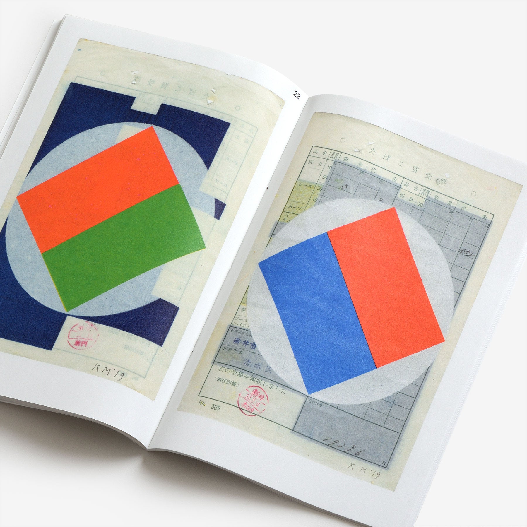 A collection of 41 monoprints created by Dutch graphic designer and typographer Karel Martens between 2019 and 2020. In 2018, Martens received a package from artist-curator Pierre Leguillon that contained filled-in Japanese forms which he had found at a street market in Tokyo. Martens was intrigued by the collection of thin paper with a rectangular black-blue layer of carbon on the back. In 2019 he started to print on these back sides, but because the overprinting on the carbon layer caused unwanted damage, he switched to printing them on the front sides as well. “The closing image is related to Tokyo in a different way,” he explains.